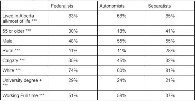Separatists are most likely to report having lived in Alberta all or most of their lives, tend to be older, live in rural areas, are white, and are the least likely to have completed university. They are also substantially less likely to be employed full time, and more likely to report being retired (28%), working part time (16%) or being unemployed (12%).