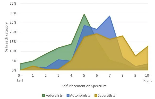 These three groups are also distinctive in political terms. As Figure 7 illustrates, when asked to place themselves on a scale from left to right, federalists tend to place themselves close to the center, while autonomists place themselves on the center-right. Almost no separatists locate themselves to the left of center, and many place themselves at the far right end of the spectrum. These findings reinforce perceptions that separatism and autonomism are closely tied to conservatism in Alberta, while support for federalism is more closely tied to centrism and progressivism.