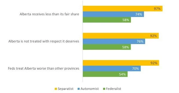 The three groups - separatists, autonomists, and federalists – have varying views about how Alberta is treated within Confederation, as Figure 6 demonstrates. While there are substantial differences between the groups, even a majority of the federalists believe Alberta receives less than its fair share, isn’t treated with the respect it deserves, and is treated worse than other provinces. This demonstrates the widespread sense of alienation within the population.